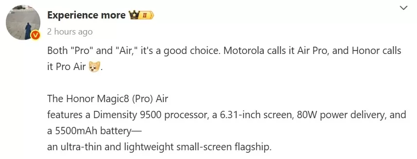 اللافت أن التلميح الجديد جاء عبر منشور على منصة Weibo لرئيس الشركة Fangfei حيث ظهرت كلمتا “Pro” و “Air” بشكل مباشر في إشارة واضحة إلى هاتف قادم يحمل هذه التسميات ورغم عدم تأكيد الاسم الرسمي حتى الآن إلا أن الترجيحات تميل إلى إطلاقه تحت اسم Honor Magic 8 Pro Air أو ربما Honor Magic 8 Air فقط وبحسب الإشارات الأولية، تخطط Honor للكشف عن الهاتف الجديد إما بنهاية الشهر الجاري أو مع بداية فبراير على أن يكون الإطلاق موجهًا في البداية للأسواق الصينية.