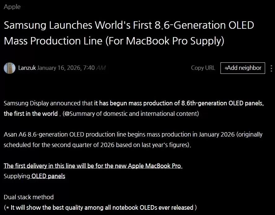ووفقًا لمعلومات متداولة في مصادر كورية، بدأت شركة Samsung Display بالفعل إنتاج شاشات OLED مخصصة لحواسيب آبل القادمة في خطوة تشير إلى تسريع جدول التصنيع مقارنة بالتوقعات السابقة التي رجّحت انطلاق الإنتاج خلال الربع الثاني من عام 2026 ورغم تباين دقة هذه المصادر في السابق فإن التوقيت الحالي يتماشى مع تقارير سابقة صادرة عن محللين معروفين في قطاع الشاشات وسلاسل التوريد.