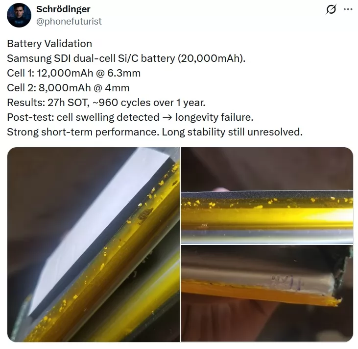 التسريب يوضح أن البطارية قيد الاختبار تعتمد على تصميم ثنائي الخلية حيث تضم خلية أولى بسعة 12,000 مللي أمبير/ساعة وبسُمك 6.3 ملم إلى جانب خلية ثانية بسعة 8,000 مللي أمبير/ساعة وبسُمك 4 ملم وخلال الاختبارات يُقال إن هذه البطارية نجحت في تحقيق زمن تشغيل شاشة يصل إلى 27 ساعة مع قدرة نظرية على تحمّل نحو 960 دورة شحن سنويًا.
