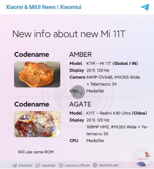 من خلال مجموعة XiaomiUI علي تطبيق تيليجرام من خلال منشور تم نشره يذكر قدوم كلا من Xiaomi Mi 11T و Redmi K40 Ultra خلال العام الجاري ، وبحسب ما تم نشره أن الهاتفين سوف يحملان معالجات من شركة MediaTek مقارنتا بالإصدارات العام الماضي التي تحمل معالجات من شركة كوالكوم ، وبحسب المنشور سوف يحم هاتف Xiaomi Mi 11T رقم اصدار K11R مع إصداره في كافة بلدان العالم مع شاشة بمعدل تحديث 120 هيرتز والتي تعد اقل من الاصدار السابق الذي يأتي بشاشة بمعدل تحديث 144 هيرتز ، لكن الفارق سوف يكم ان الاصدار الجديد سوف يكون بشاشة من نوع OLED بدلاً من ips .