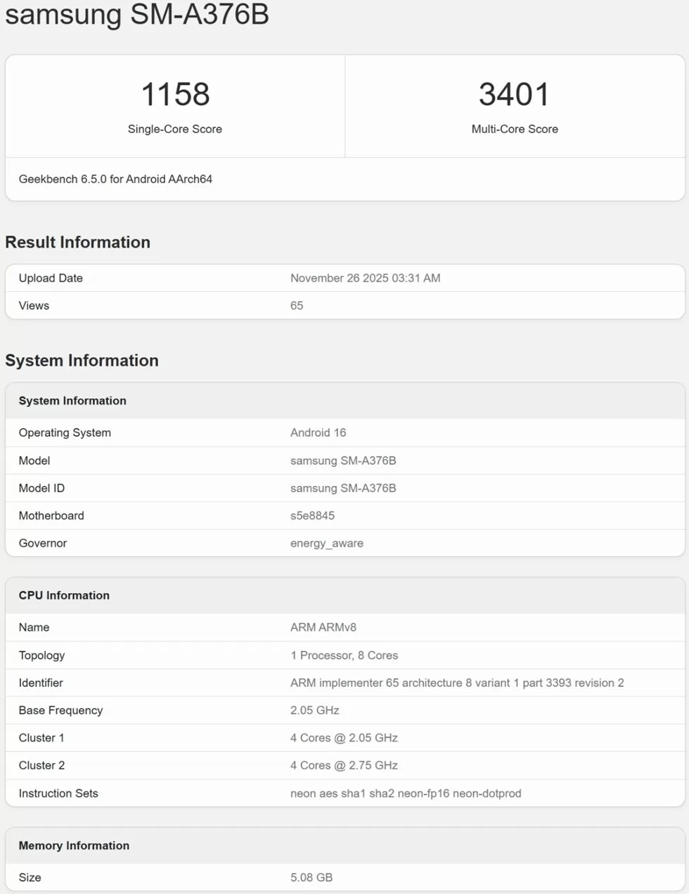 هذا التسريب لم يقدم تفاصيل تقنية واضحة حول الهاتف لكنه كان كافيًا لإثبات أن الهاتف قادم بالفعل، غير أن مصدر المعلومات الأهم جاء من منصة تقيمات الأداء Geekbench حيث ظهر الهاتف تحت رمز الطراز SM-A376B كاشفًا عن أول معلومة جوهرية تخصه وهي إصدار المعالج.