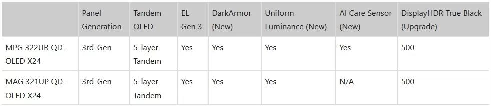 في المقابل، يقدّم طراز MSI MAG 321UP QD-OLED X24 نفس الأساس التقني من حيث اللوحة وتقنيات DarkArmor Film و Uniform Luminance ودعم HDR لكنه يستغني عن مستشعر العناية الذكي ويستهدف هذا الإصدار المستخدمين الراغبين في أحدث تقنيات QD-OLED مع الحفاظ على سعر أقل نسبيًا دون ميزات إدارة اللوحة المعتمدة على الذكاء الاصطناعي.