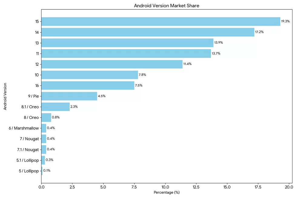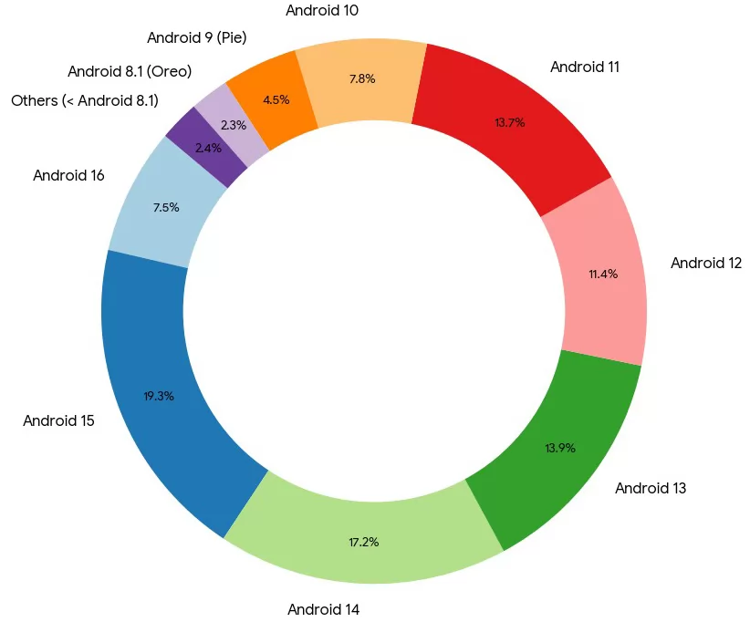 أما الإصدار الأكثر انتشارًا حاليًا، فهو أندرويد Android 15 الذي يستحوذ على 19.3% من إجمالي الأجهزة، يليه أندرويد Android 14 بنسبة 17.2% ثم أندرويد Android 13 بحصة 13.9% وفي المقابل يحتل أندرويد Android 16 المركز السابع فقط في ترتيب الإصدارات حيث يسبقه أيضًا كل من Android 11 و Android 12 و Android 10 على التوالي.