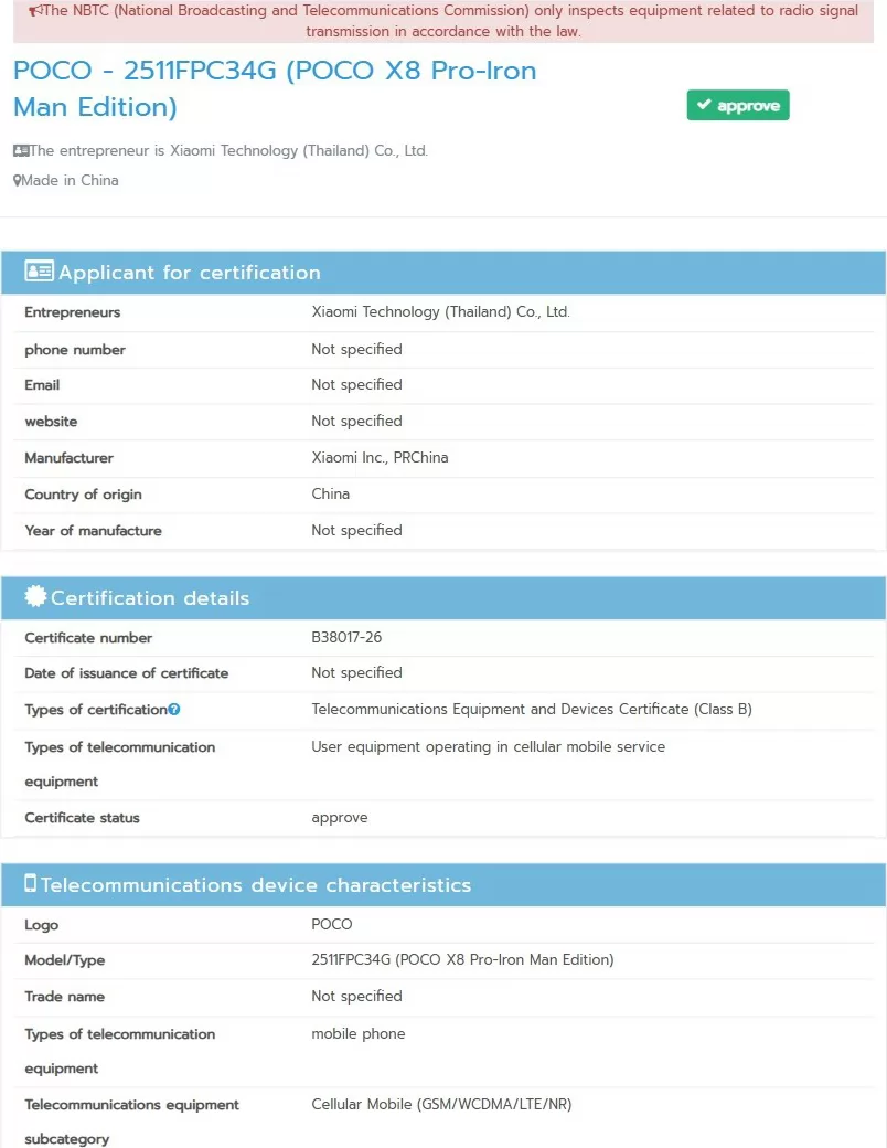 وتشير أحدث التطورات إلى أن موعد الكشف عن السلسلة أصبح قريبًا بعدما حصل هاتف Poco X8 Pro على موافقة هيئة NBTC في تايلاند ووفقًا لبيانات الاعتماد ظهر إصدار خاص من الهاتف تحت اسم Poco X8 Pro Iron Man Edition ويحمل رقم الطراز 2511FPC34G.